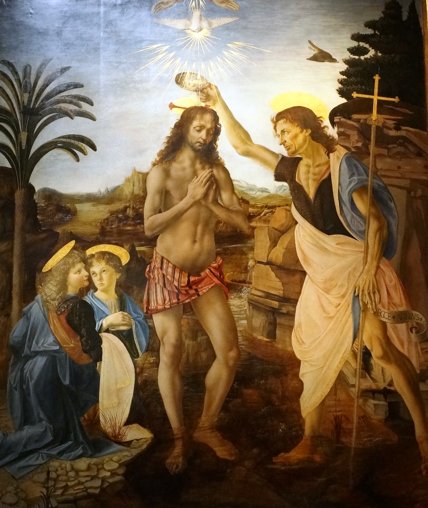 The Baptism of Christ, c. 1472-75, Andrea del Verrocchio and Leonardo da Vinci, oil on canvas at the Galleria degli Uffizi, Florence
