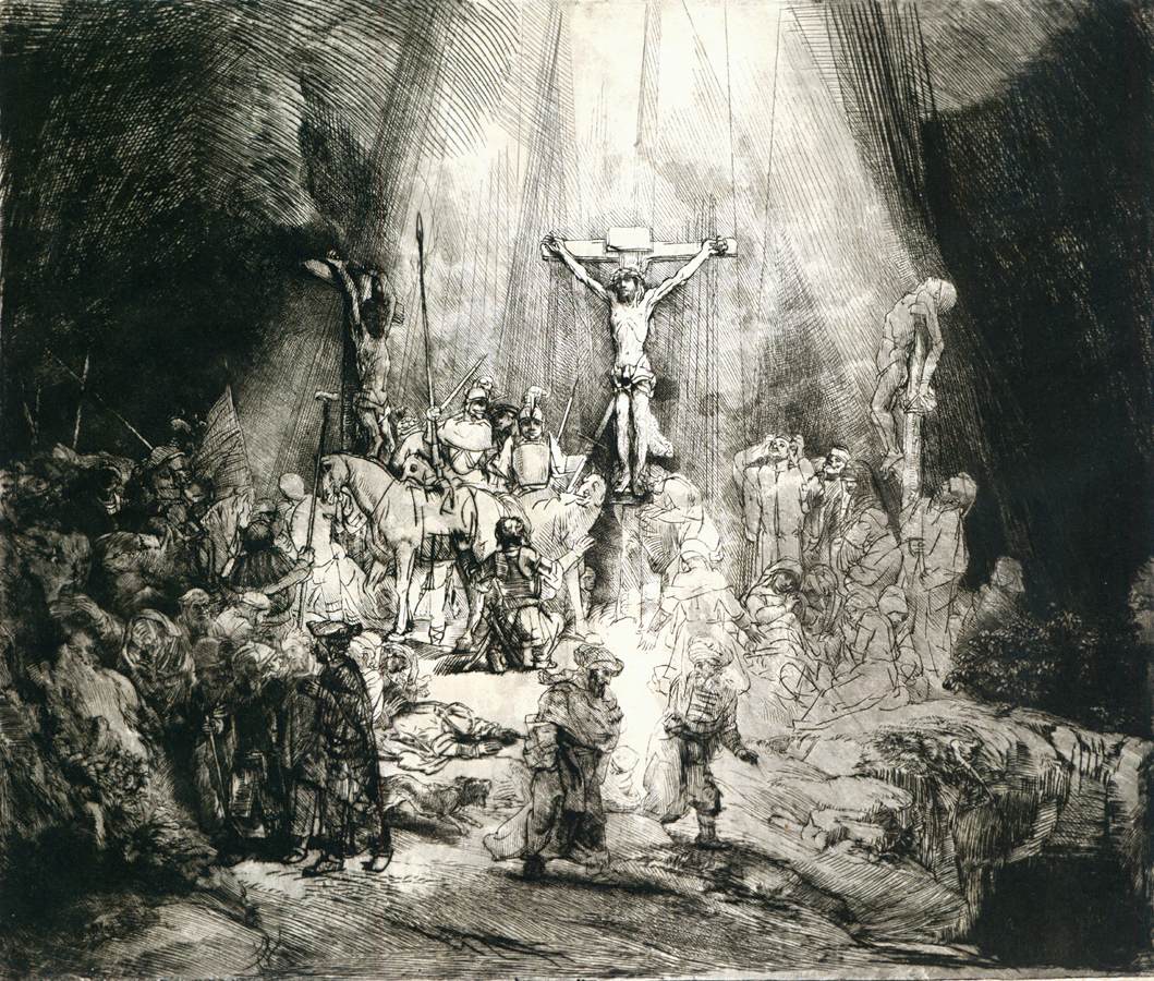 Christ crucified between the two thieves "The Three Crosses", 1653, Harmenszoon van Rijn Rembrandt, Drypoint and burin, first state of five at Teylers Museum, Haarlem, Netherlands